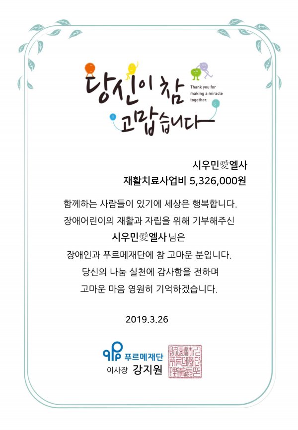 푸르메재단(이사장 강지원)은 26일 인기 아이돌그룹 엑소(EXO) 멤버 시우민의 생일을 맞아 팬클럽 ‘시우민의 愛엘사’가 장애어린이 재활치료를 위해 532만6천 원을 기부했다고 밝혔다.