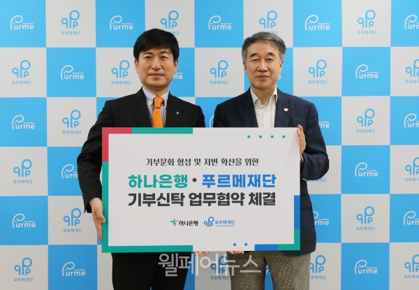 푸르메재단은 지난 18일 서울시 종로구 신교동 푸르메재단에서 하나은행과 국내 기부문화 확산을 위한 협약식을 진행했다고 밝혔다.