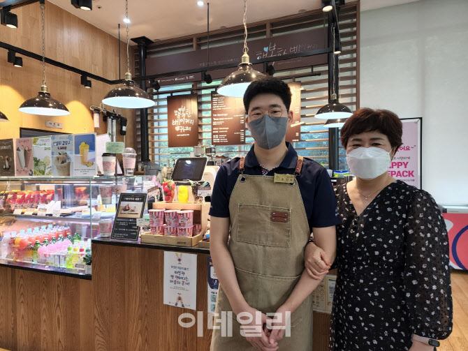 22일 서울 상암동 넥슨 어린이 재활병원 1층 ‘행복한 베이커리 카페’에서 이데일리와 만난, 중복장애(자폐·지적)를 가진 윤장호(남·27)씨와 어머니 신윤정(53)씨. (사진=황병서 기자)