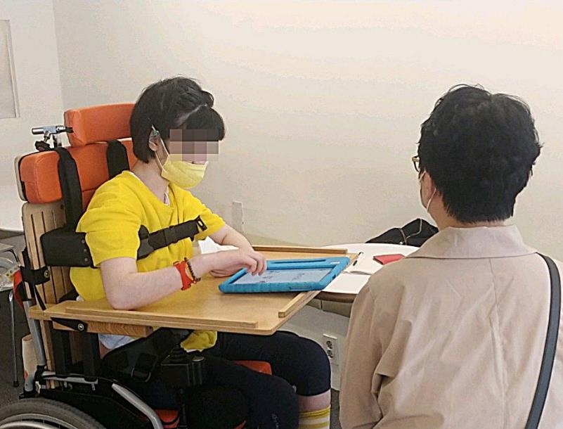 AAC 장치를 이용해 어머니와 대화 중인 송민혜양