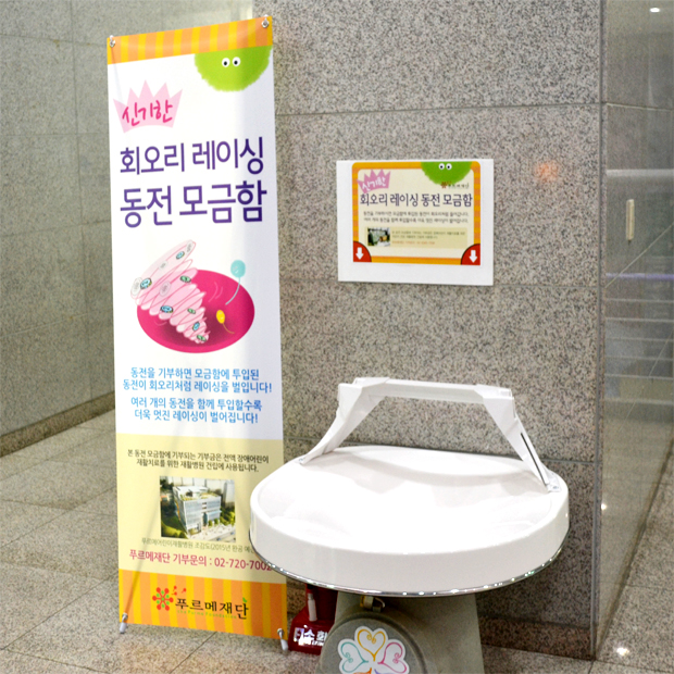 종로구 세종마을 푸르메센터 1층. 둥그런 세숫대야 같은 생김새에 어디에 쓰는 물건일까 하고 흠칫 놀랍니다. 동전을 넣으면 빙글빙글 돌아가며 구멍에 쏙 들어가는 재미나고 신기한 모금함입니다. 동전이 넘어지지 않고 아주 빠른 속도로 회전하는 게 특징인데요. 여러 개의 동전을 동시에 넣으면 경주하듯 레이싱을 펼쳐서 볼거리를 제공합니다.
