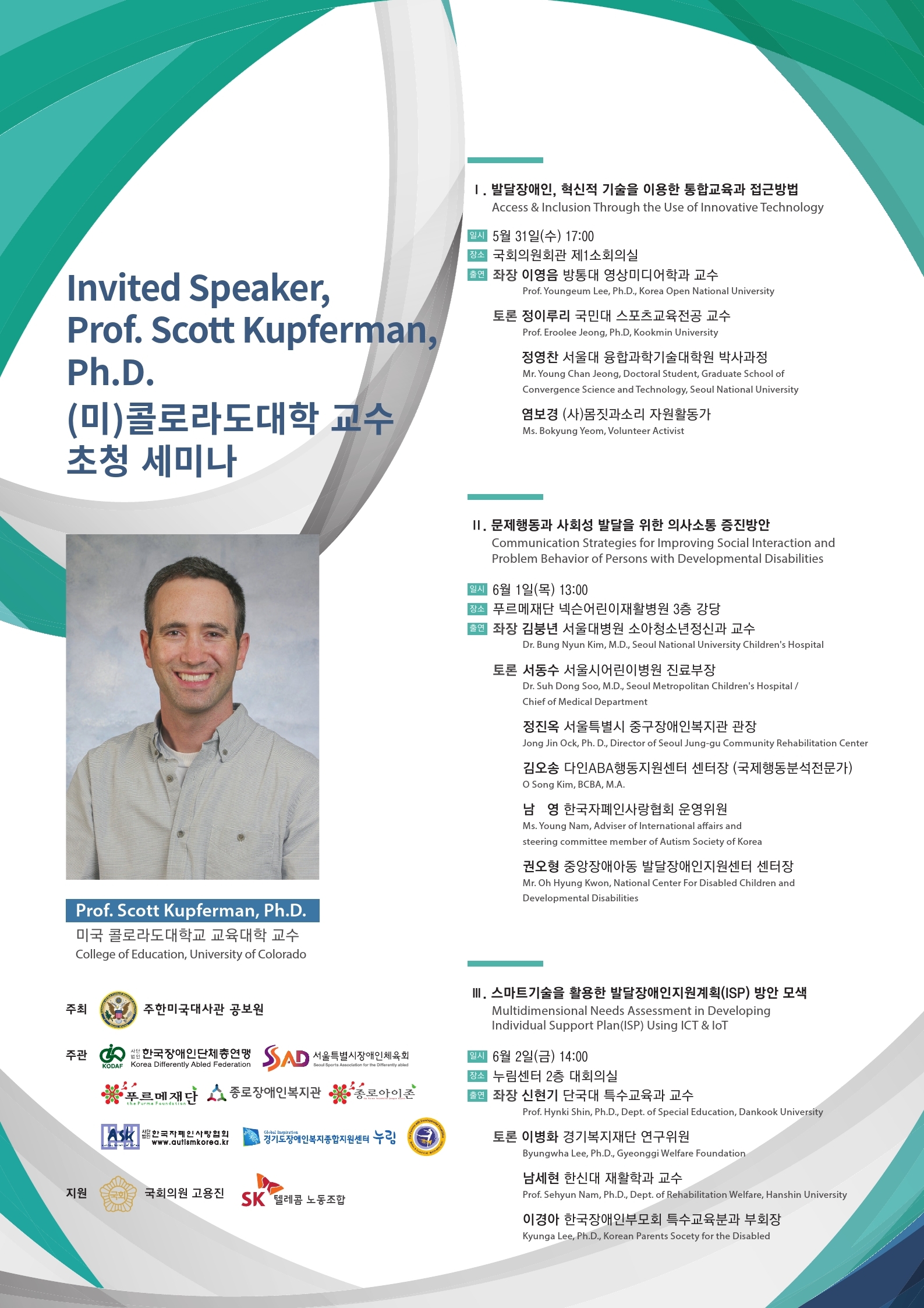 Disability, Technology & Special Education 전문가인 美 콜로라도주립대 Kupferman 교수를 초청, 세미나 개최를 통해 발달장애인의 문제행동과 사회성증진을 위한 의사소통 방안에 대한 미국과 한국의 현황을 소개하고 이를 통해 관련 실무자 역량 강화와 부모의 양육지원 방향을 모색해 보는 자리를 마련하였습니다.