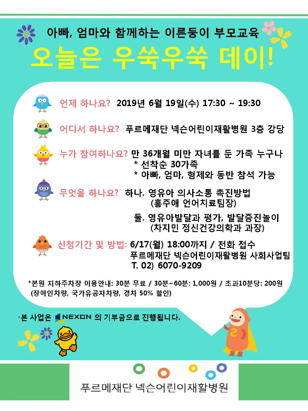 푸르메재단 넥슨어린이재활병원에서는 만 36개월 미만 자녀를 둔 보호자들의 양육에 대한 이해를 도모하고 발달 증진에 조력하기 위해 보호자를 대상으로 다음과 같이 부모교육을 진행하고자 하오니, 홍보와 협조를 요청드립니다.