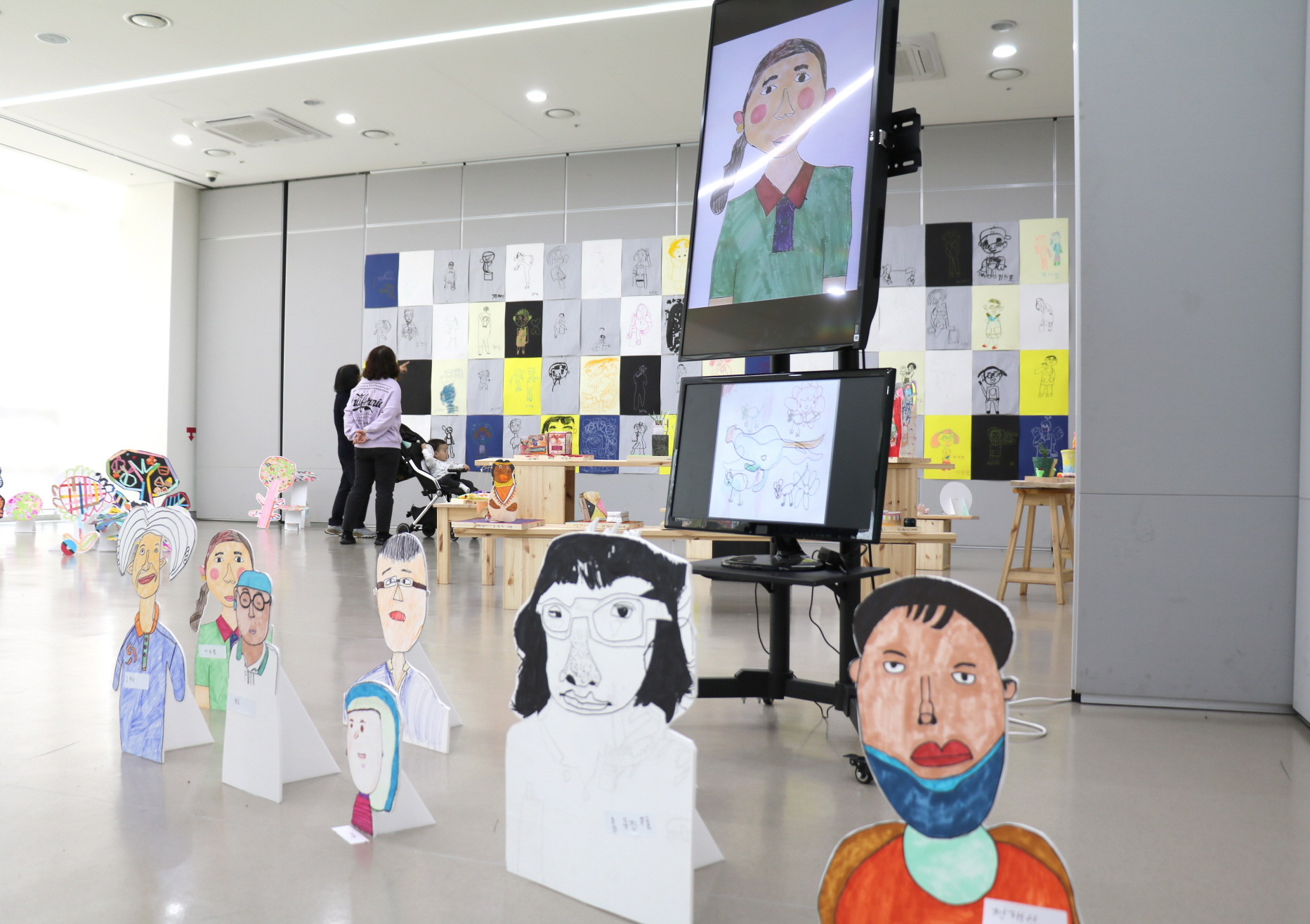 이번 전시는 한국예술인복지재단에서 파견된 예술인들과 센터 장애인 직원들이 오감을 깨우며 작업했던 드로잉, 꼴라쥬, 입체 작품 등이 전시되어 있습니다. 각 직원들이 직접 그린 자화상에 음성을 입혀 자기소개 애니메이션으로 만든 영상 작품이 특히 눈길을 끕니다. 전시장을 꽉 채운 다양한 작품에서 직원들의 숨길을 느끼고, 애니메이션을 통해 직원 한 명, 한 명에 대해서 알게 되니 그들과 한층 더 가까워진 것 같습니다.