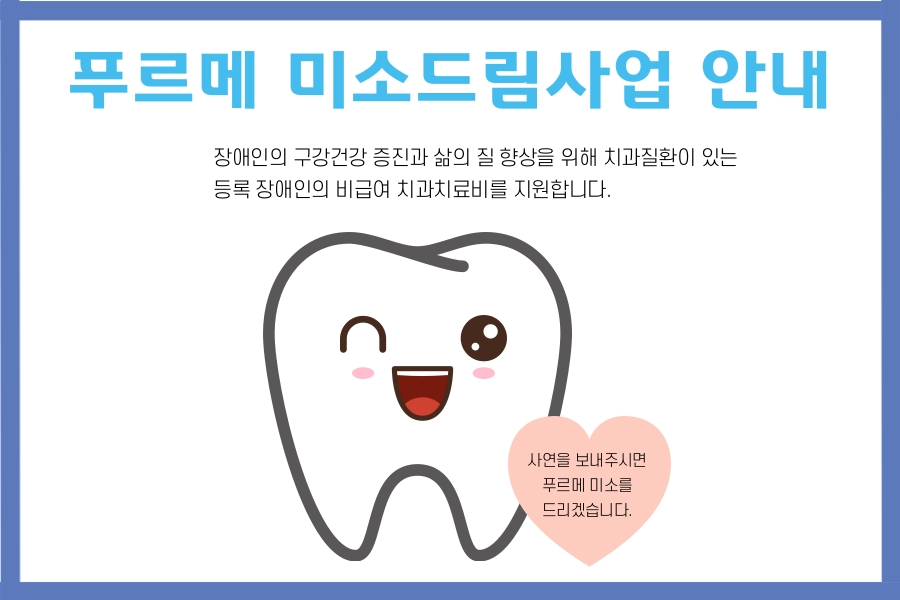 본원 통합치과진료센터에서 비급여 치과 치료비 지원사업인 <푸르메 미소 드림 사업>을 진행합니다. 치과질환이 있는 등록 장애인들의 비급여 치과치료비를 지원하여 구강건강 증진을 도모하고, 2차적인 장애를 예방하여 삶의 질 향상에 기여하고자 합니다. 많은 관심과 참여 부탁드립니다.