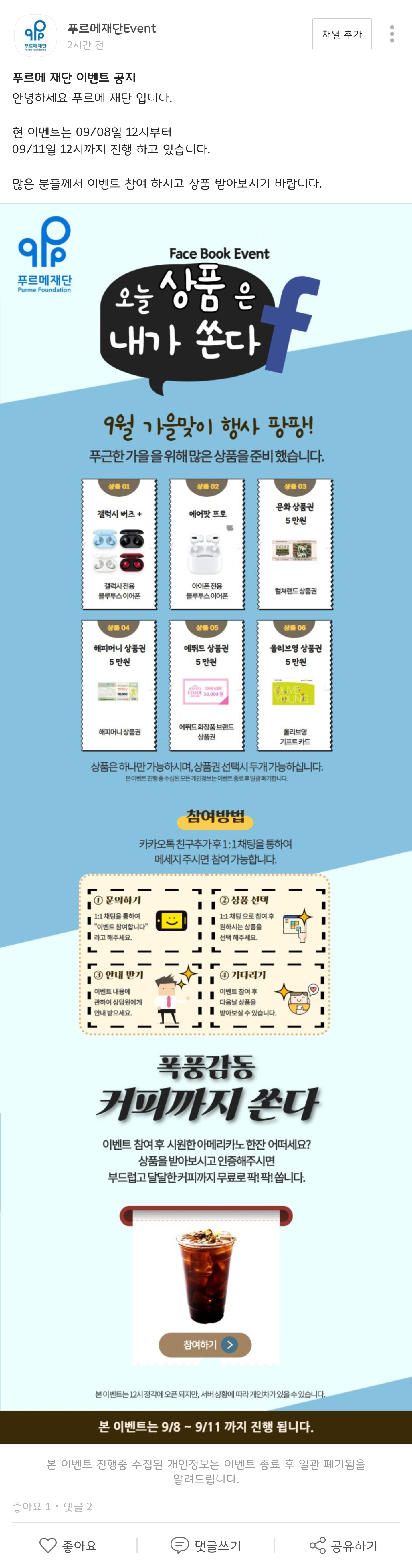 현재 SNS(페이스북, 인스타그램, 카카오톡채널 등)를 통해 푸르메재단을 사칭하여 갤럭시 버즈+, 에어팟 프로, 문화상품권 등을 무료 증정한다는 내용이 유포되고 있음을 확인했습니다.