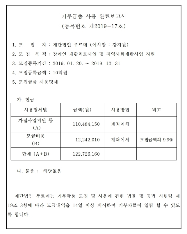 재단법인 푸르메는 기부금품 모집 및 사용에 관한 법률 및 동법 시행령 제19조 3항에 따라 등록번호 제 2019-17호 ‘장애인 재활치료사업 및 지역사회재활사업 지원’을 위한 기부금품 사용내역을 다음과 같이 공개합니다.