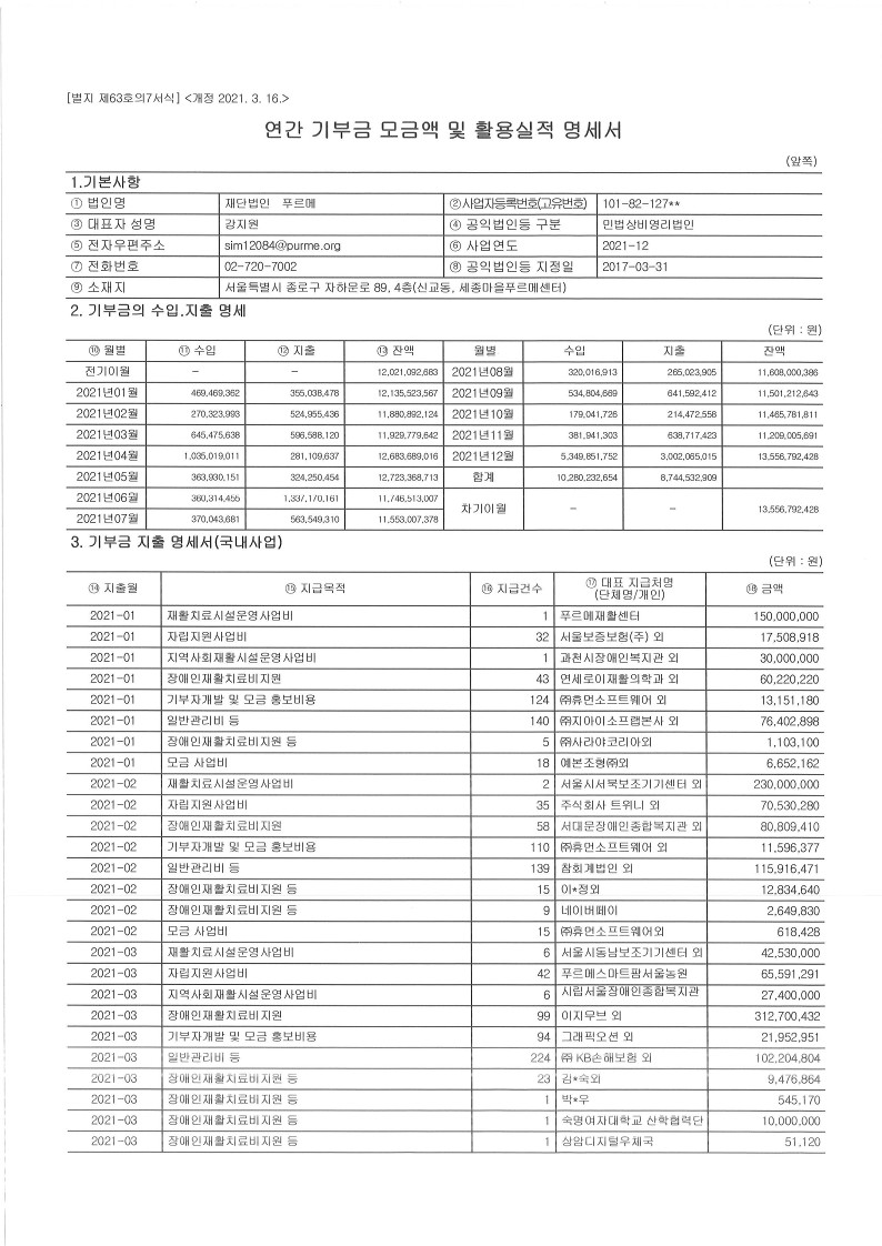 [공개] 2021 연간 기부금 모금액 및 활용실적 명세서