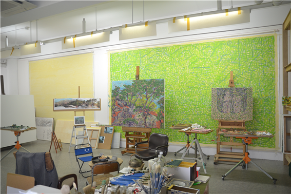 작업실 한쪽에는 연두색이 가득 칠해진 캔버스가 벽을 채우고 있었습니다.