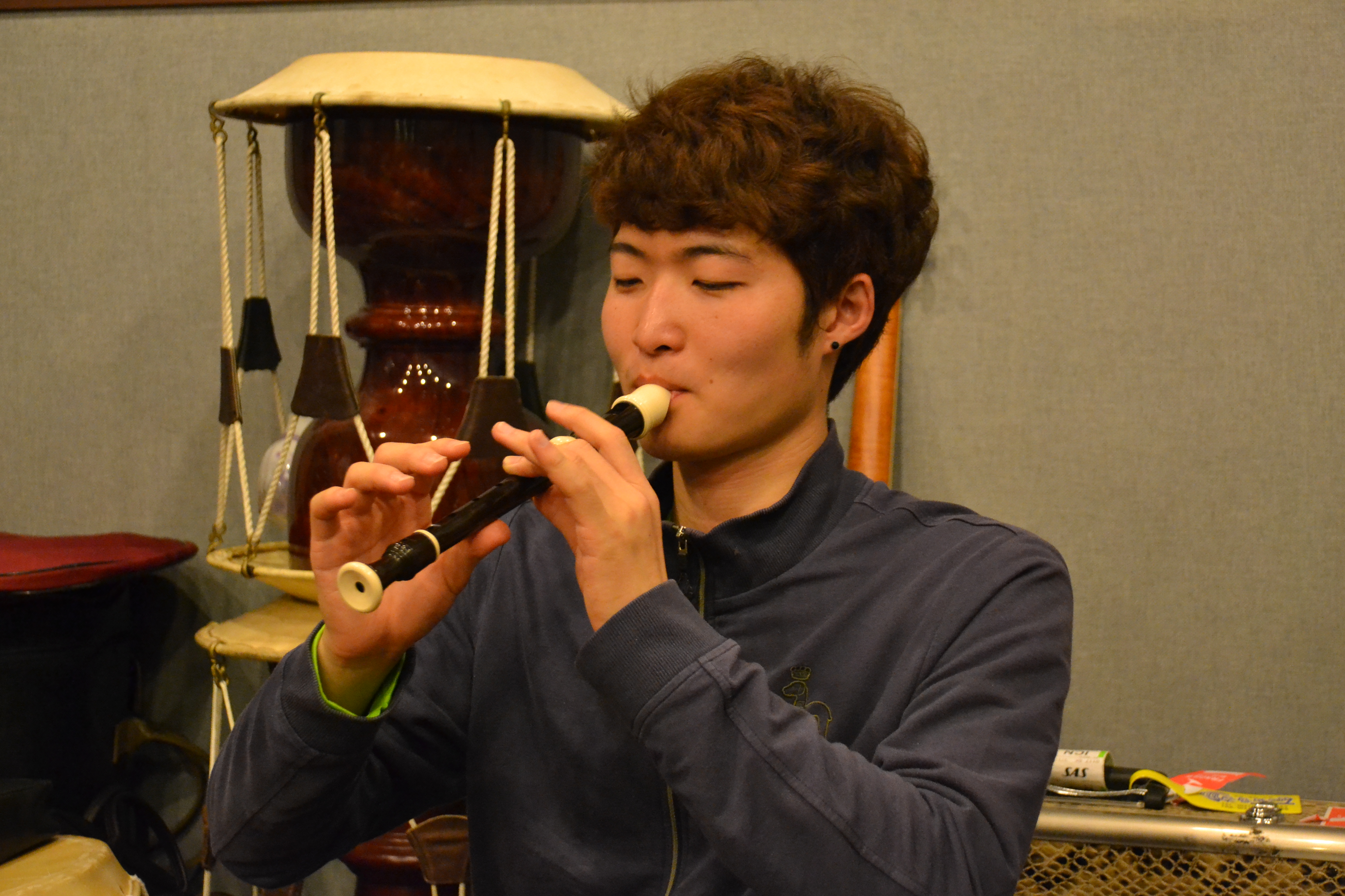 ▲ 한 단원이 “음, 이제 맞는 것 같아.”라며 서로 쥐고 있는 악기의 음을 맞추자 연주가 시작되었다. 리듬에 맞춰 대나무 타악기를 연주하는 박준호, 신경환, 조형곤 씨와 리코더를 불고 있는 고태욱 씨의 모습(위-왼쪽에서 시계방향). 이석현 씨는 개인적인 사정으로 연습을 못 나왔다.