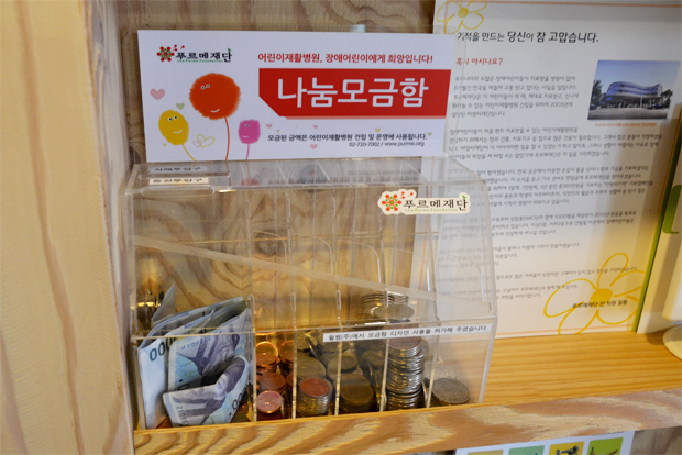 혜화점에는 푸르메재단의 나눔모금함이 두 개나 있습니다. 하나는 카운터 뒤에 또 하나는 서가 가운데에 당당히 놓여있습니다. 아이 어른 할 것 없이 보는 사람마다 신기해하면서 좋아한답니다. 김미영 대표가 먼저 “이거 봐라~”하면서 시범을 보여주면 아이들은 금새 엄마한테 잔돈을 얻어와 동전 넣기 삼매경에 푹 빠집니다. 음료를 기다리는 어른들에게는 넌지시 뒷편의 어린이재활병원 전단지를 봐달라고 요청합니다. 주로 아이 있는 젊은 엄마들이 관심을 보이는데 푸르메재단은 뭐하는 곳이고 병원을 진짜 만드는지 되묻곤 한답니다. “어린이재활병원 건립이라는 확실하고 구체적인 목표가 있고 성과가 가시적으로 나타나니 설명하기 좋아요. 세금이 어떻게 쓰이는지 알면 돈이 아깝지 않은 것처럼 기부금이 어떻게 쓰이는지 아는 게 중요한 것 같아요.”라며 핵심을 가리킵니다.