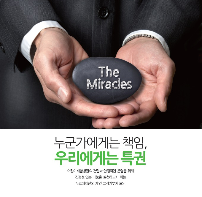 고액기부는 다양한 사회 문제를 해결하고 세상을 아름답게 변화시킬 수 있는 ‘특권’입니다. 국내 턱없이 부족한 병원에 고통 받는 장애어린이들과 가족의 희망이 될 어린이재활병원을 함께 짓는 일도 ‘특권’입니다. 푸르메재단은 어린이재활병원이라는 기적을 만들어가는 사람들을 ‘더미라클스(The Miracles)’라고 부릅니다.