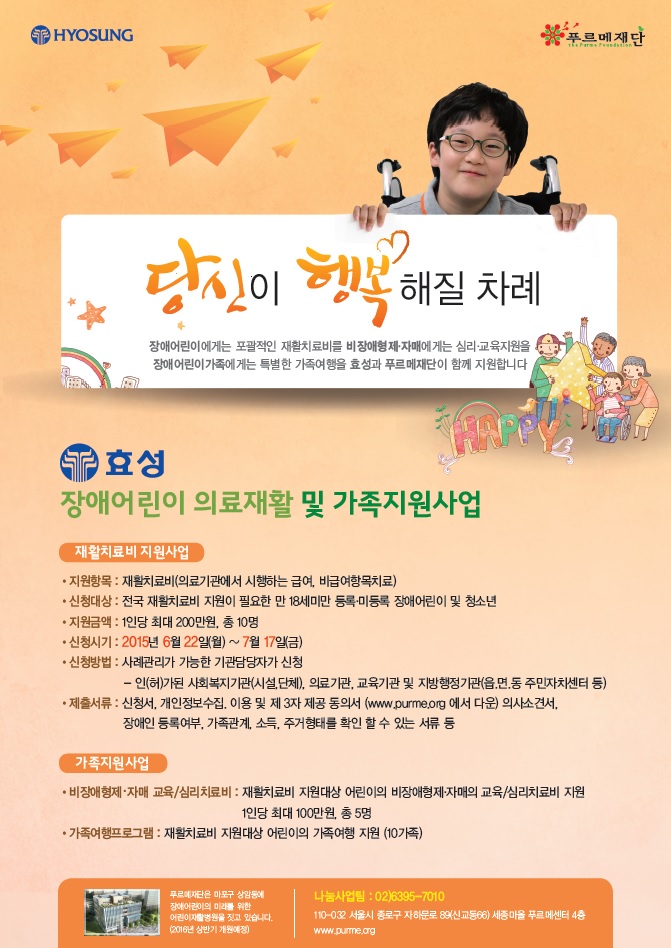 푸르메재단은 효성그룹과 함께 장애어린이와 가족을 다양한 방법으로 지원하고 있습니다. 2013년을 시작으로 올해 3년째 진행되고 있는 <장애어린이 의료재활 및 가족지원사업>은 장애어린이에게는 집중적인 재활치료를 받을 수 있도록 치료비를, 비장애형제·자매에게는 교육비와 심리치료비를 지원합니다. 또한 장애어린이 가족이 특별한 추억을 만들 수 있도록 가족여행도 함께 선물합니다. 만 18세미만의 장애어린이라면 누구나 신청이 가능합니다. 푸르메재단과 효성그룹은 더 많은 장애어린이와 가족들이 건강하고 행복한 삶을 누릴 수 있도록 응원하겠습니다.