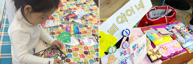 처음이라 어색한지 머뭇거리던 것도 잠시, 아이들은 딱지·축구화·학용품 등 직접 가지고 온 물건을 하나하나 진열하고 손수 가격표를 붙입니다. ‘솔이네’ 최고의 인기 상품은 왕딱지. 준비한 수량이 턱없이 부족했습니다.