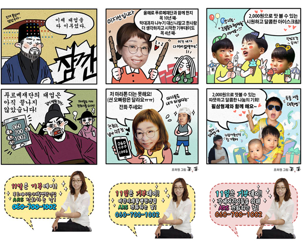 매달 11일이 되면 푸르메재단 페이스북에는 두 컷 만화가 등장합니다. 기부자들이 등장해 ARS 한 통의 전화 후원을 요청하는 만화. 인물의 특징을 그대로 살려내 감탄과 웃음을 자아내고 어느새 수화기를 들어 전화를 하게 만듭니다. 만화의 힘을 빌리지 않았더라면 나눔이 이렇게 재미있고 쉽다는 것을 알리지는 못했을 터. 만화를 그린 주인공은 2년째 자신의 재능을 아낌없이 쏟아내는 조하영 만화 작가입니다.