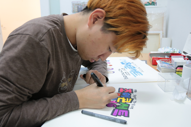 발달장애인 공동체 기금 마련을 위한 포스터 작업에 열중하고 있는 정도운 씨