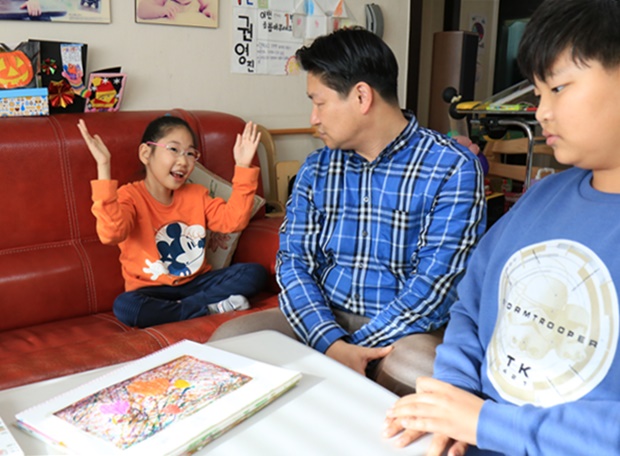 ▲ 미술시간에 그린 그림을 가족들에게 설명하고 있는 은영이.