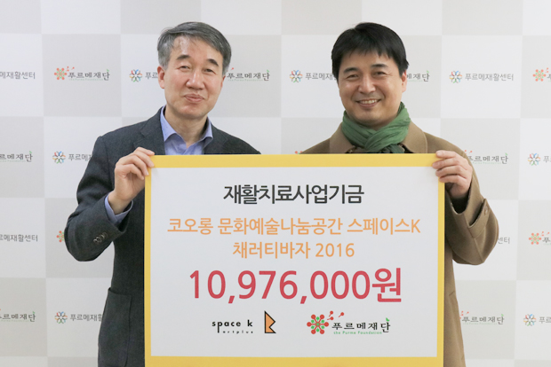 스페이스K와 예술가들이 함께 조성한 기부금은 마포구 상암동 어린이재활병원 재활치료사업비로 쓰입니다. 3년째 어린이재활병원 건립 기금부터 재활치료사업 기금 마련까지 누적 기금만 2천6백여만 원. 예술을 통해 장애어린이들에게 따뜻한 나눔을 실천하는 고마운 분들의 따스한 마음이 푸르메를 가득 채웁니다.