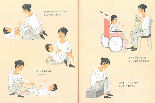 엄마의 하루는 정신없이 바쁘게 흘러갑니다. 찬이를 일으켜 앉혀 씻기고 입히고 먹이면 물리치료와 인지치료를 받으러 병원으로 향합니다. 매일같이 반복되는 재활치료는 하루라도 빼놓을 수 없습니다. 오후 늦게 집에 와서는 찬이의 몸이 굳지 않도록 운동을 시켜줍니다.