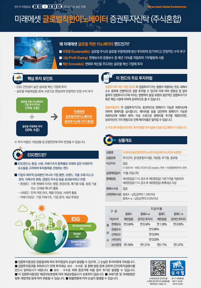 ‘글로벌착한이노베이터’는 지속가능성에 초점을 맞춘 펀드입니다. 환경(Environment), 사회(Social), 지배구조(Governance)를 의미하는 ESG 건전성이 높은 기업에 집중적으로 투자합니다.