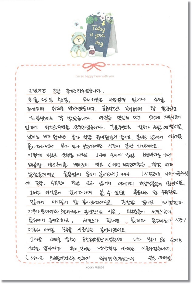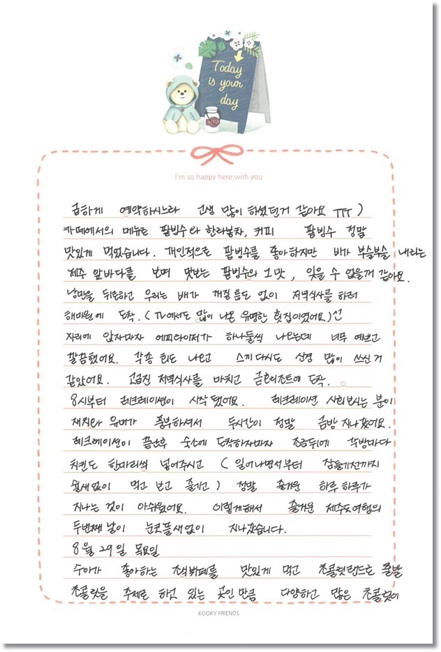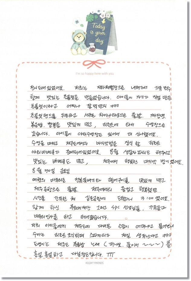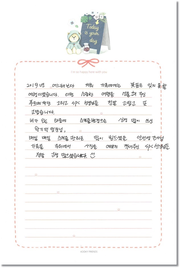 지난 8월 27일부터 30일까지 4일간 SPC그룹의 지원으로 장애어린이 10가족이 제주도를 다녀왔습니다. 짓궂게 내리는 늦은 여름비에 아쉬운 마음도 잠시, 다양한 체험으로 제주도에서 새로운 행복을 찾고 앞으로 나아갈 희망의 불씨를 키워 온 가족들. 특히 제주에 있던 매 순간을 잊지 못한 추억으로 쌓아올린 수아네 가족의 편지를 공개합니다.