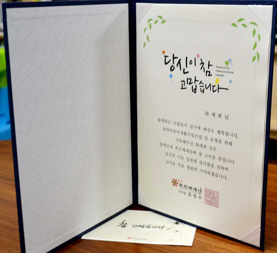 부부는 어려운 상황에서 치료를 받는 푸르메재단 넥슨어린이재활병원의 장애어린이들을 위해 써달라며 예희의 장애진단 보험금 중 일부를 내놓았습니다.