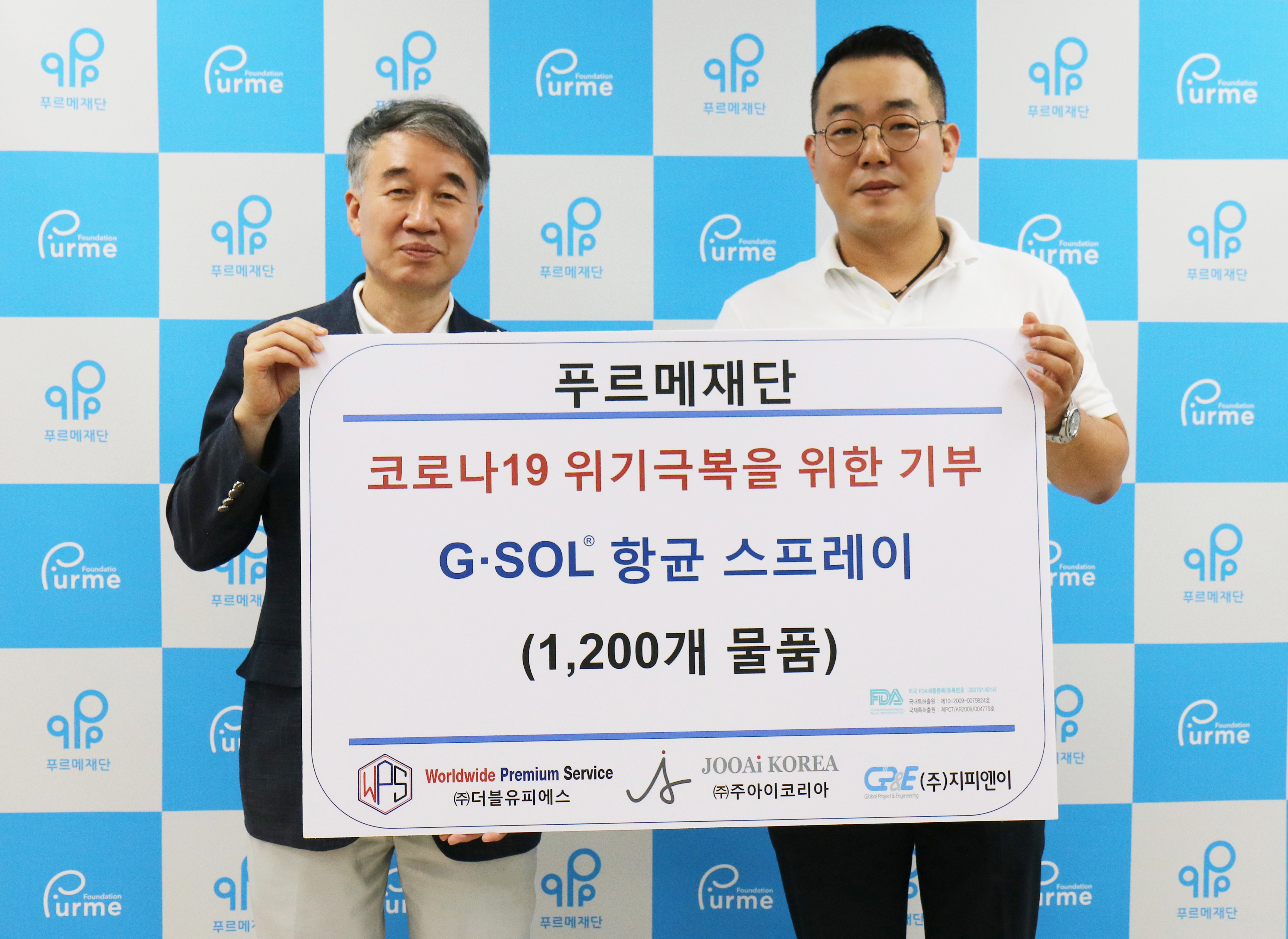 지난 12일 우중건 한국체육지도자연맹 부이사장과 ㈜더블유피에스/주아이코리아(대표 박정민)가 푸르메재단과 산하기관을 위해 G-Sol 항균 스프레이 1,200개를 기부했습니다.