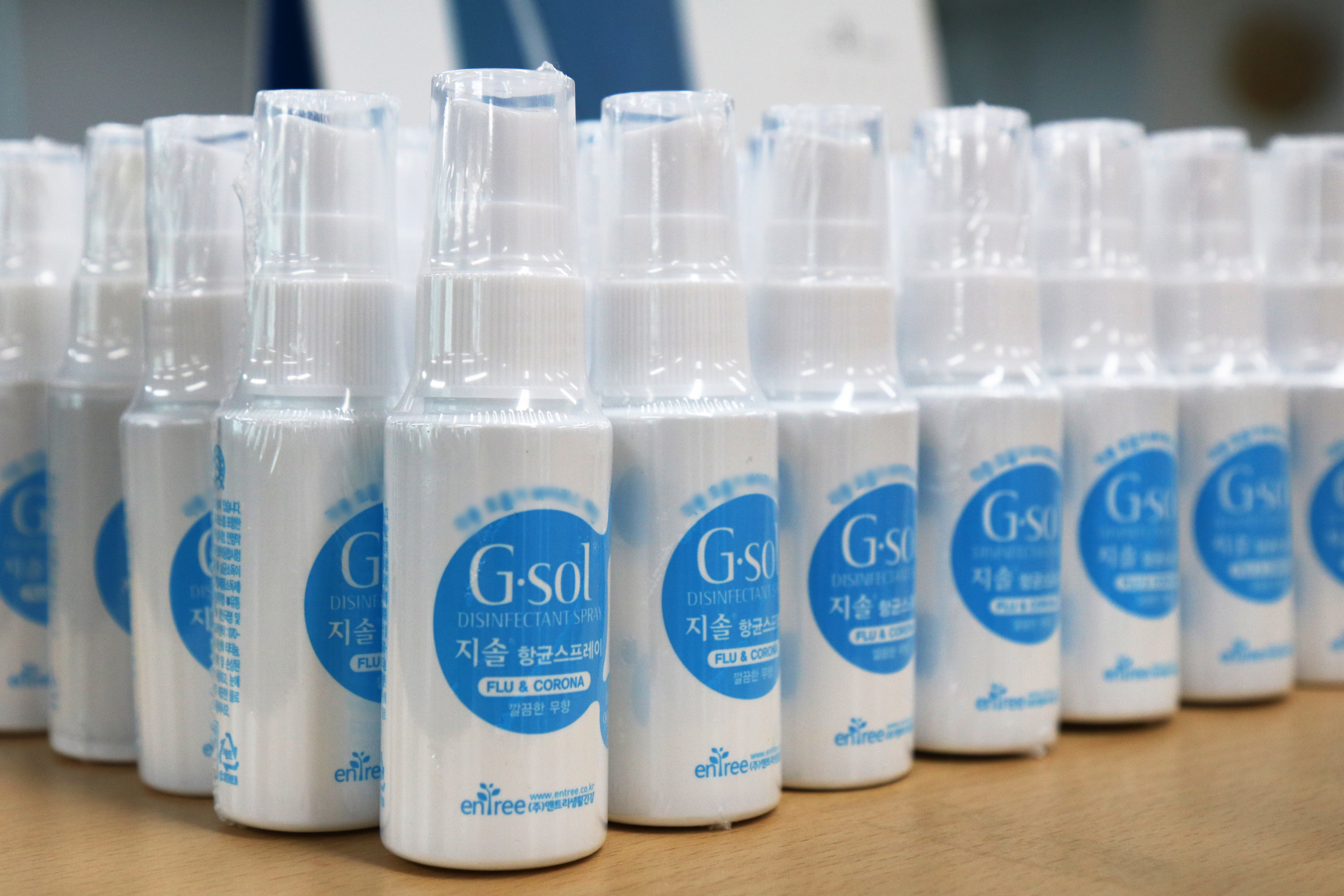 ㈜지피엔이가 개발한 특허물질로 미국 FDA에 등록된 G-Sol 항균 스프레이. 미국 FDA가 인증한 국제공인시험기관 ‘마이크로 바이오 테스트(Microbio Bio Test, MTB)’의 인플루엔자 바이러스 및 메르스 코로나바이러스(MERS-CoV) 사멸 테스트에서 99.99% 이상 살균 효과를 확인한 항균 제품이라고 합니다.