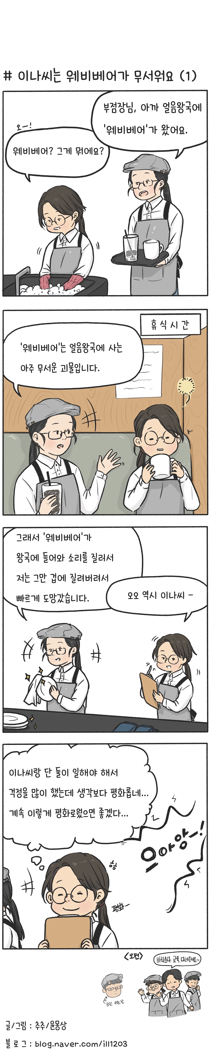 거북일기6. 이나씨는 웨비베어가 무서워요(1) 2020.08.31 이나씨는 왜 갑자기 겁에 질린 걸까요? 다음 화를 기대해주세요. *글= 추예진 점장 (행복한베이커리&카페 고덕점) *그림= 윤상일 점장 (행복한베이커리&카페 종로점) 기부하기 웹툰 <거북일기> 모아보기