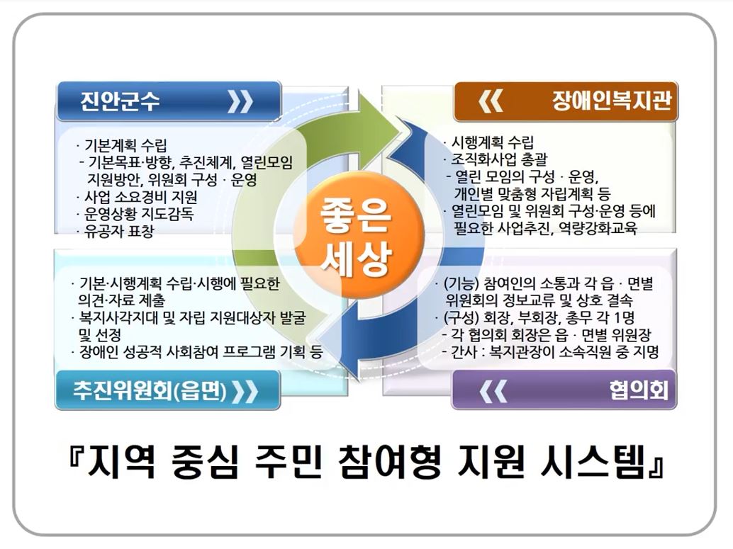 전라북도 진안군은 광범위한 면적에 장애인복지시설은 겨우 7개, 그중 6개가 진안읍에 있어 복지접근성이 취약한 지역입니다. 진안군장애인종합복지관은 이러한 단점을 보완하기 위해 지역사회 내에서 복지자원을 찾고 마을 단위의 장애인복지를 생각했습니다.
