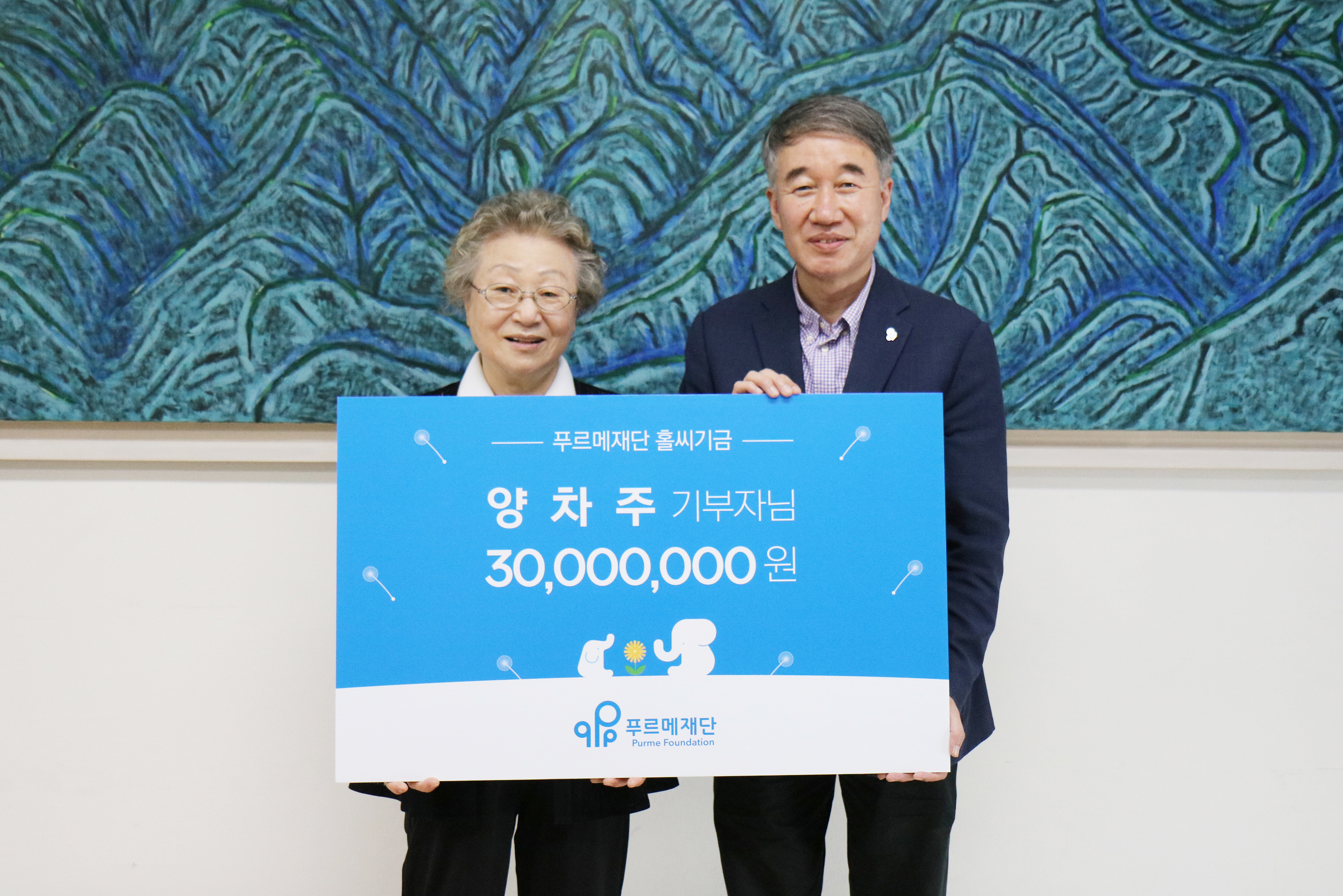 “마음을 먹으면 미루지 않아야 합니다” 구순을 바라보는 나이의 양차주 씨가 오랜 세월 꾸준히 기부를 실천할 수 있었던 다짐입니다. 얼마 전 푸르메재단을 찾아온 양 씨는 하얀 봉투 하나를 건넸습니다. 그 안에는 손수 준비한 기부금이 들어있습니다. “시간이 지나면 꼭 마음이 흔들리더라고. 이렇게 봉투에 넣고 바로 실행해야 적은 것이라도 기부할 수 있어요” 장애인, 비장애인이 함께하며 하나가 되면 좋겠다는 소망에, 개인 기부로 적지 않은 금액을 선뜻 내놓았습니다.