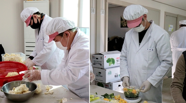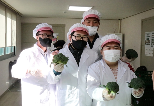 교육을 마친 이들에게 주어진 첫 업무는 농작물 1차 가공. 대형마트와 식품판매 온라인 플랫폼에 농산물을 납품하는 농업회사법인 ㈜프레베와 협력해 콜리류(브로콜리와 콜리플라워)를 손질해 담습니다.