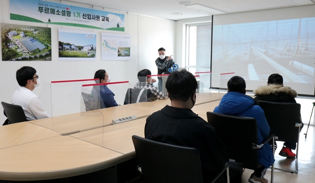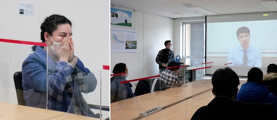 그 순간 교육이 진행되는 회의실에서는 갑작스럽게 영상이 전환되더니 푸르메소셜팜 직원들의 교육과 훈련을 담당하고 있는 채춘호 팀장이 등장합니다.