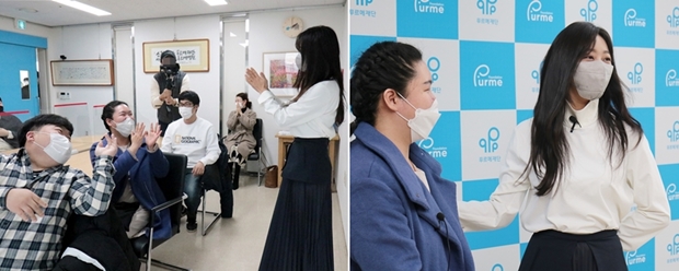 그때 조보아 씨가 문을 열고 들어왔습니다. 추가교육생으로 뽑혀 자리를 지키던 소셜팜 직원들의 눈이 점점 커지더니 “조보아 씨다” “엄마랑 같이 TV에서 봤다”며 무척 반가워합니다. 정화 씨에게 깜짝 축하인사를 건네며 상품을 건네는 모습에는 부러움을 감추지 못합니다.