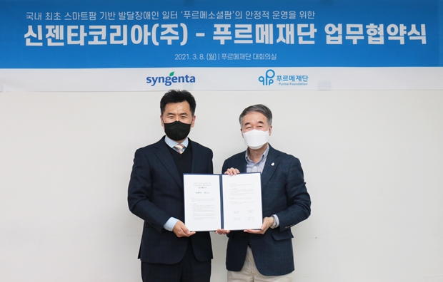 세계적인 농업기업인 신젠타코리아의 박진보 대표와 직원들이 푸르메재단을 방문해 장애청년들의 완전한 자립을 위해 푸르메소셜팜의 지속가능한 성장에 힘을 보태기로 협약을 맺었습니다.