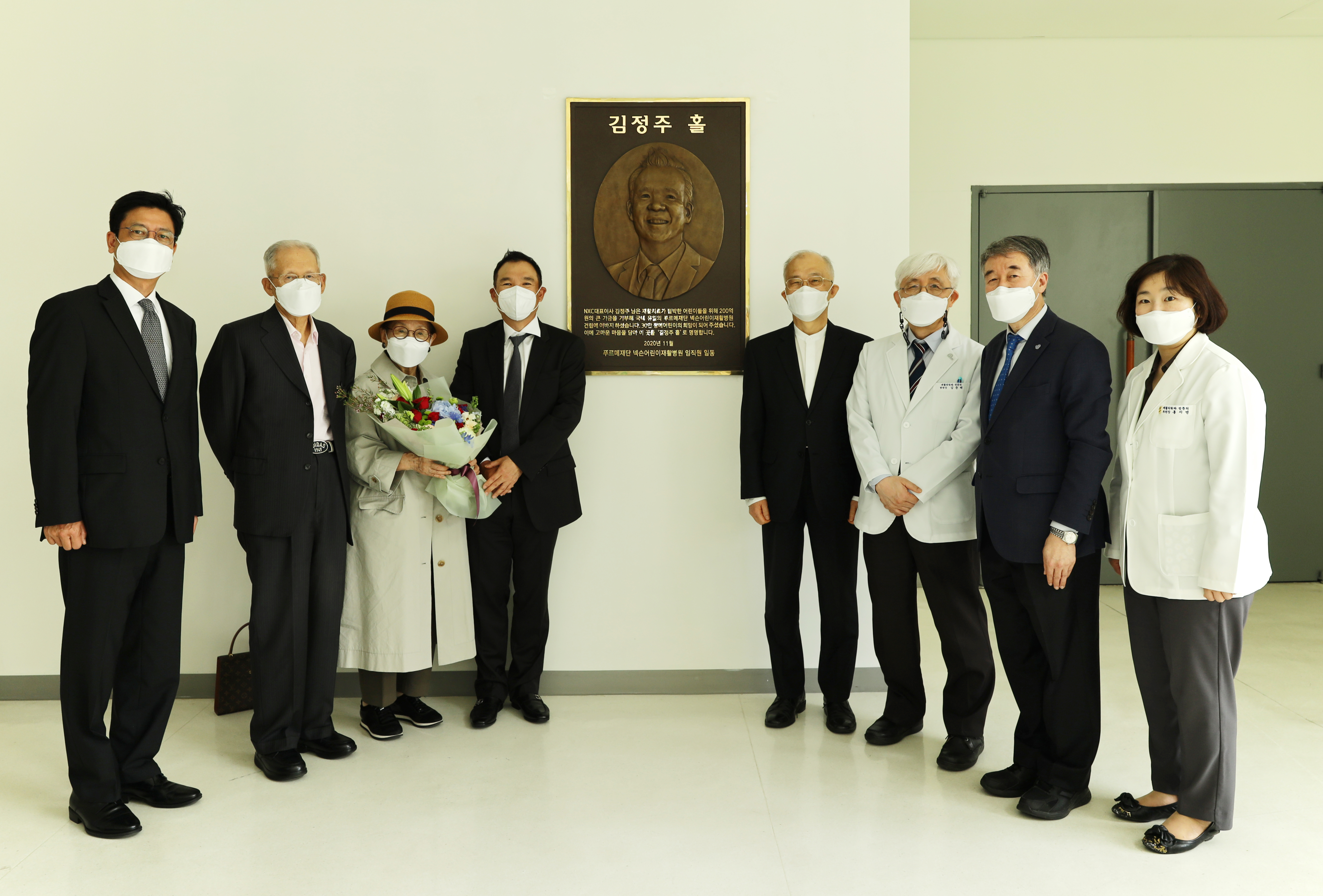 기념식에 앞서 병원 건립에 큰 힘이 되어 준 김정주 대표의 공로를 기리기 위한 김정주홀(옛 푸르메홀) 제막식도 열렸습니다. 어린이들의 미래에 관심이 많았던 김정주 대표는 2012년 종로구 신교동에 있는 푸르메재활센터 건립에 10억 원을 기부한 데 이어 푸르메재단 넥슨어린이재활병원 건립기금으로 200억 원을 쾌척했습니다.