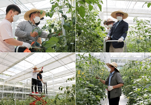 토마토가 자라는 온실에서는 리프트를 타고 온실 꼭대기까지 올라가 유인줄을 묶는 작업과 곁순을 따는 작업에 대한 교육이 진행됐습니다. 온실 꼭대기까지 리프트를 타고 올라야 해 난도가 높은 유인물 묶는 작업에는 김정호 기부자가 손을 번쩍 들며 지원합니다.
