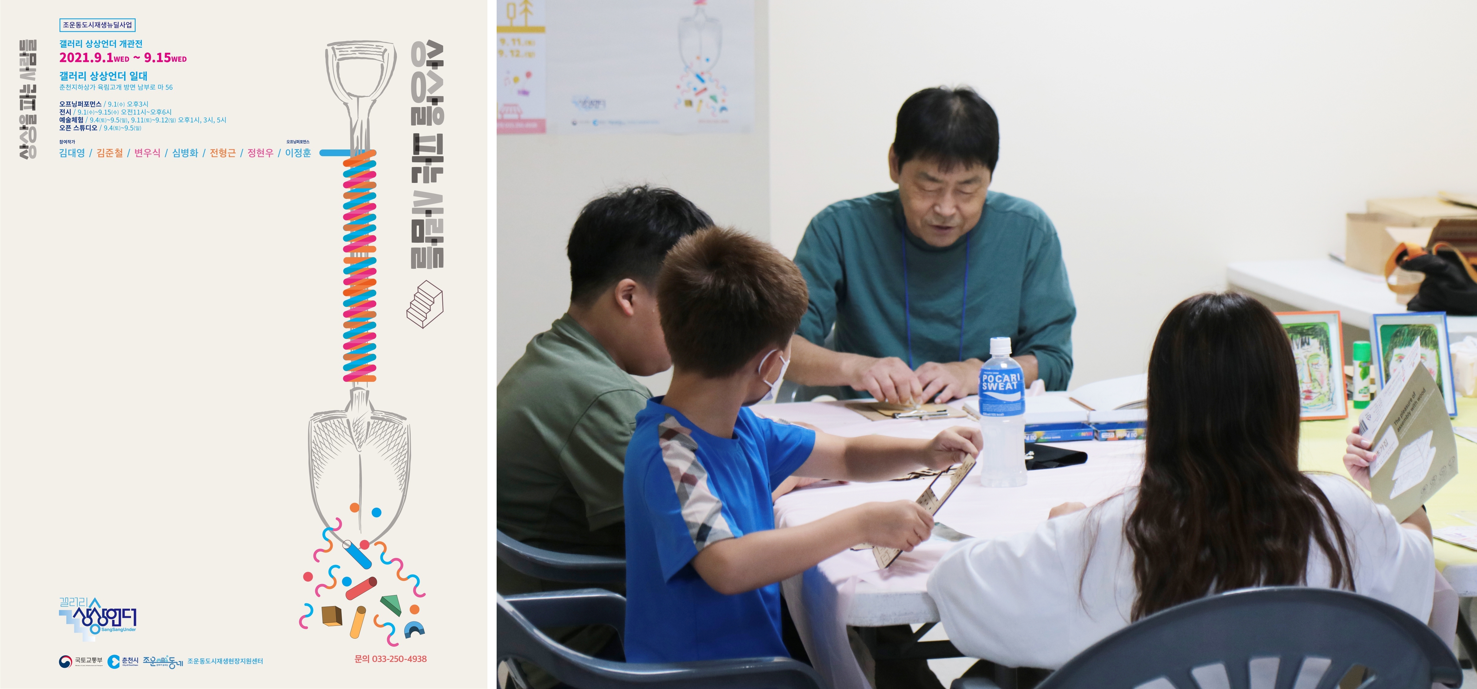 당시 거칠고 무거운 그림책의 분위기에 대해 사람들이 의문을 품자 “이 문제가 해결되지 않으면 앞으로 나아갈 수 없었다”라고 전한 김준철 작가. 꿈틀거리는 용기와 의지, 그리고 가장 낮은 곳에 사는 사람들의 작은 움직임을 다시 만난 곳은 춘천시 지하상가에 문을 연 갤러리 상상언더 개관전 <상상을 파는 사람들>이었습니다.