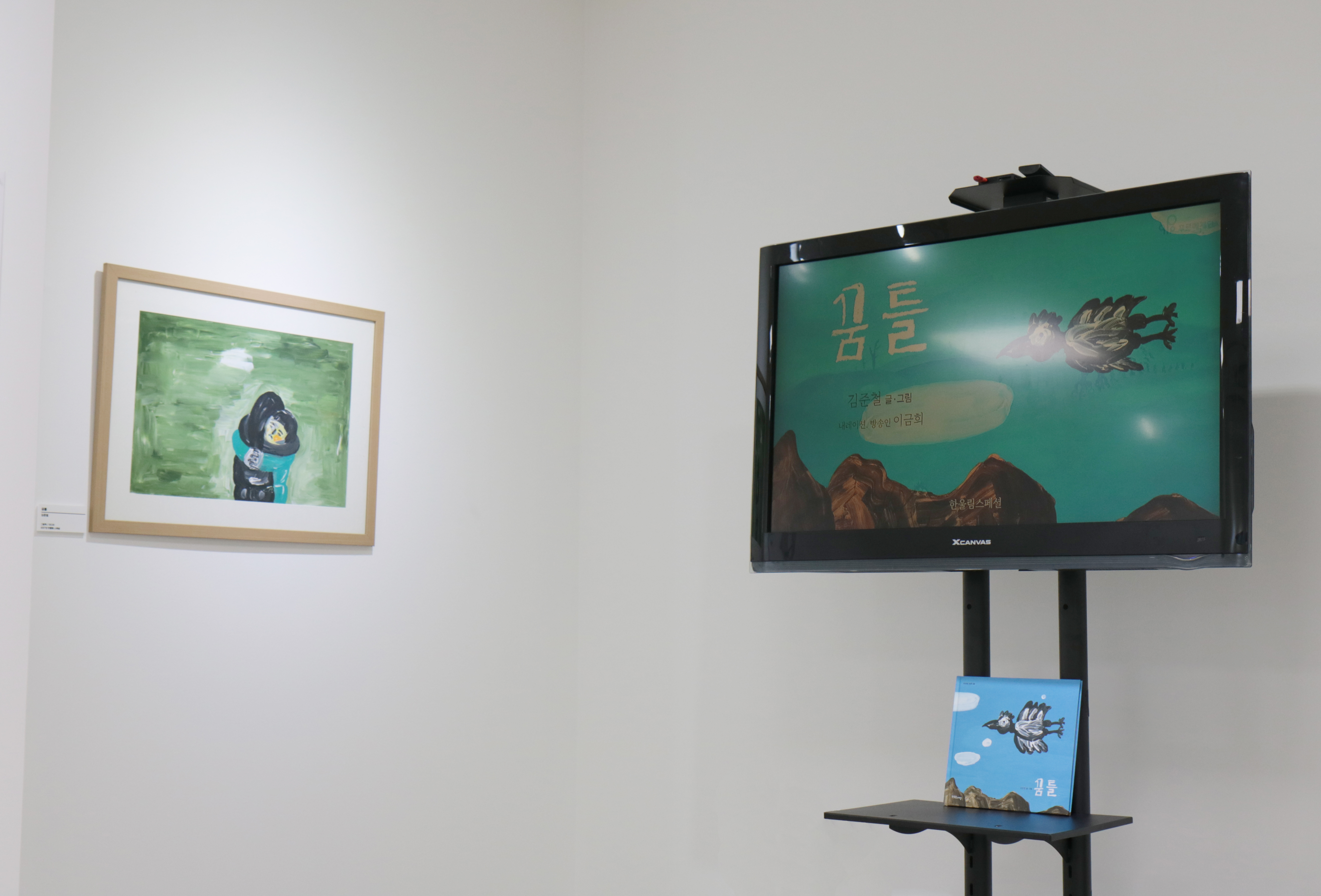 이번 전시에서 <꿈틀>은 그림책에 실린 삽화의 원화 1점과 올해 푸르메재단이 원작을 바탕으로 제작한 애니메이션으로 관객들을 만났습니다. 작가는 “그림책보다 영상이 제가 말하고 싶은 바를 훨씬 정확하게 표현했어요. 시간이 지나면서 <꿈틀>이 잊히는 줄만 알았는데, 덕분에 전시에 상영하게 되면서 더욱 내용에 집중할 수 있게 됐어요”라며 고마운 마음을 보입니다.