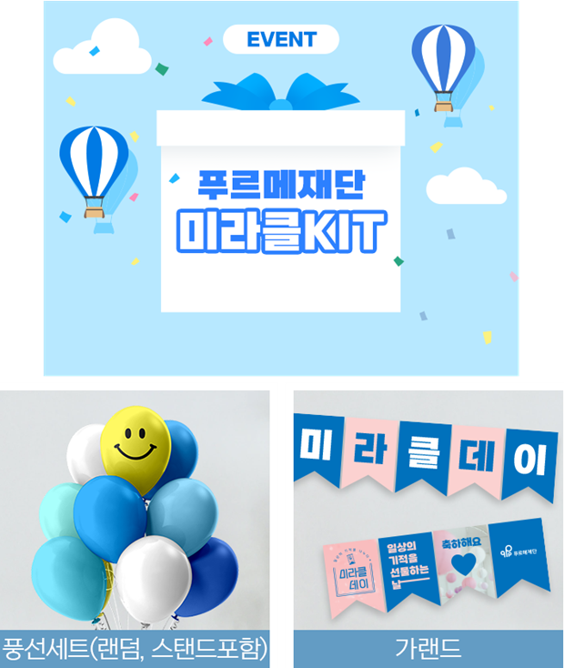 10월 31일까지 미라클데이에 참여하신 분들께 풍선, 풍선 스탠드, 가랜드로 구성된 ‘파티 키트’를 드립니다. 소중한 가족, 가까운 친구와 함께 당신의 기념일을 함께 즐기며 선한 영향력을 펼쳐주세요!