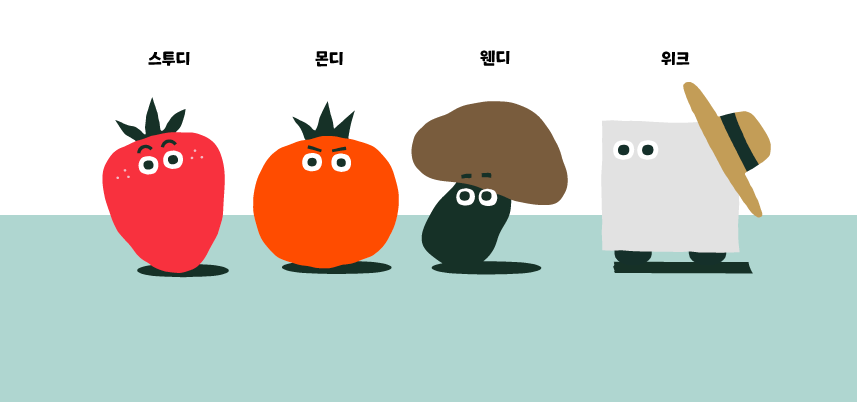 몬디와 웬디, 스투디는 푸르메소셜팜에서 재배하는 혹은 재배할 예정인 농작물을 형상화한 캐릭터입니다. 위크는 발달장애 청년들을 돕는 스마트 로봇 캐릭터지요. 실제로 농장에는 장애청년들 대신 무거운 짐을 날라주는 스마트 로봇들이 부지런히 돌아다니고 있습니다. 각 캐릭터는 푸르메소셜팜 청년농부들의 성격을 꼭 빼닮았답니다.