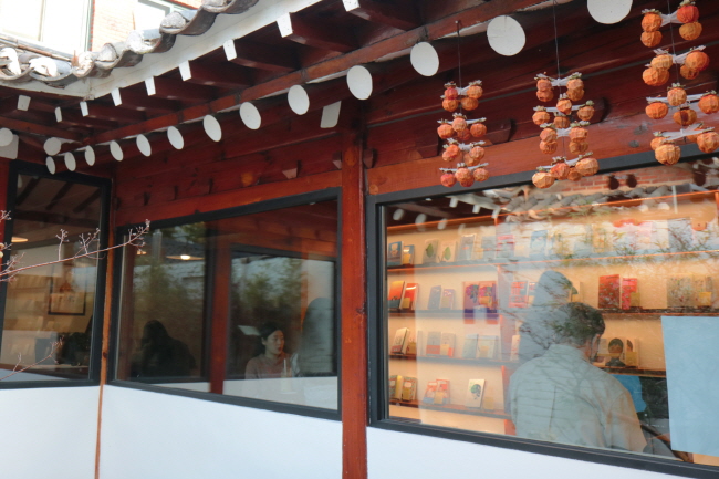 수확한 감을 처마 밑에 매달아 말리는 정감 넘치는 동네 책방. 일일호일 마당에는 21년 된 감나무가 있다.