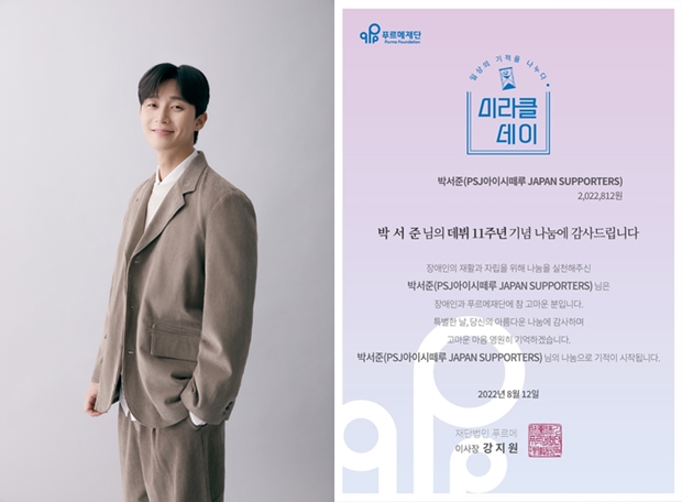 12일은 배우 박서준 씨의 데뷔 11주년 기념일입니다. 한국을 넘어 해외에서도 큰 인기를 얻고 있는 배우죠. 그런만큼 일본 팬들이 박서준을 축하하는 마음으로 기부에 나섰습니다. ‘일본 서포터즈 PSJ아이시떼루’가 행덕챌는지에 참여해 박서준 씨의 특별한 날을 아름다운 선행으로 빛낸 것입니다. PSJ아이시떼루의 기부는 처음이 아닙니다. 데뷔 10주년을 맞았던 지난해에도 장애청년들의 자립을 응원하며 푸르메소셜팜 건립기금을 전달해 감동을 주었습니다. 박서준 씨의 특별한 날을 맞아 푸르메재단 홈페이지에도 축하 배너가 걸렸습니다. 매 작품마다 좋은 연기로 팬들에게 보답하는 박서준 배우의 다음 작품도 기대가 됩니다.